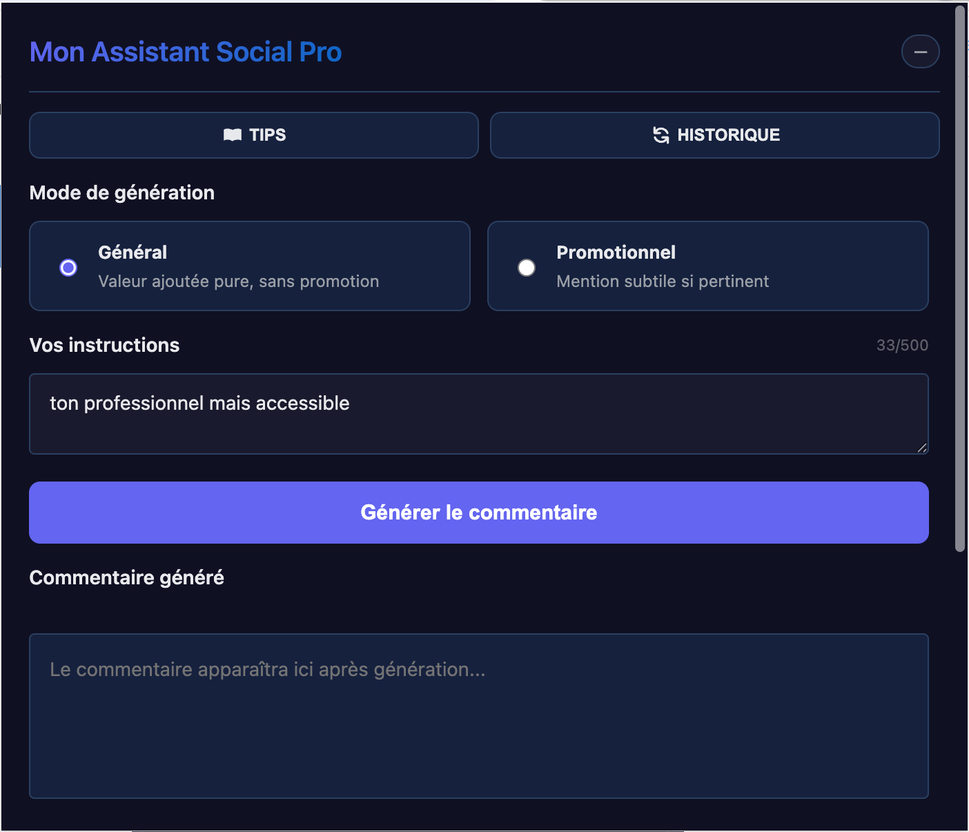 Un simple clic, tu choisis "Commentaire Général" ou "Commentaire Promo", et l'IA analyse le contexte du post + ton profil