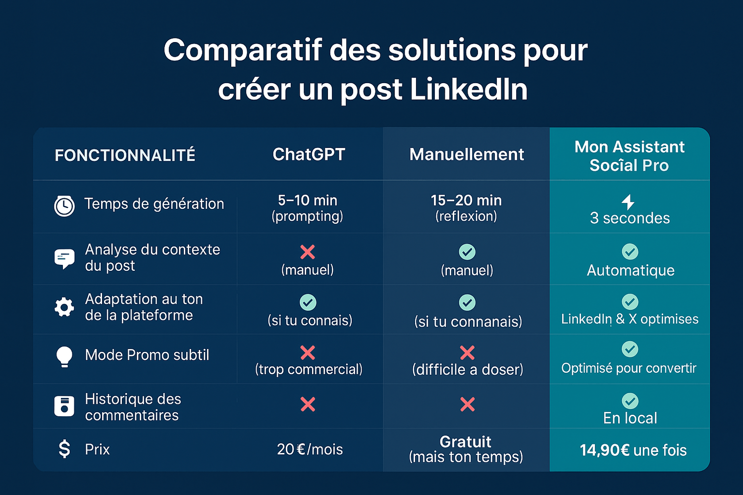 ChatGPT nécessite 5-10 minutes de prompting à chaque fois (copier le post, expliquer le contexte, demander le bon ton...). Mon Assistant Social Pro fait tout ça automatiquement en 3 secondes. De plus, il est spécifiquement entraîné pour LinkedIn et X, avec mémorisation de ton profil.